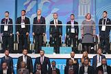 Рабочая поездка председателя правительства Дмитрия Медведева в Красноярск. XIX Всемирная зимняя Универсиада 2019. Президент FISU Олег Матыцин (третий слева) и председатель правительства России Дмитрий Медведев (четвертый справа) на церемонии закрытия Универсиады в ледовом дворце "Платинум Арена Красноярск".