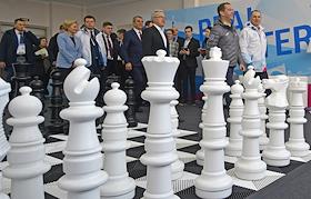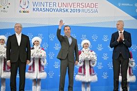 Рабочая поездка председателя правительства Дмитрия Медведева в Красноярск. Председатель Правительства России Дмитрий Медведев (в центре) во время посещения Деревни Универсиады-2019.