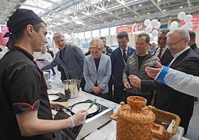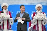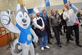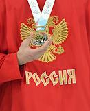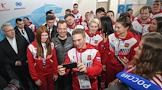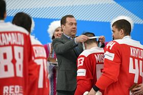 Рабочая поездка председателя правительства Дмитрия Медведева в Красноярск. Жанровая фотография. Игрок студенческой сборной России по хоккею с золотой медалью.