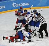 Рабочая поездка председателя Правительства России Дмитрия Медведева в Красноярск. Игроки студенческих сборных команд по хоккею России и Словакии во время финального матча на XXIX Всемирной зимней универсиаде 2019 года в Ледовом дворце "Кристалл арена".