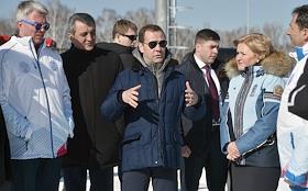 Рабочая поездка председателя Правительства России Дмитрия Медведева в Красноярск. Слева направо: министр спорта России Павел Колобков, полномочный представитель президента России в Сибирском федеральном округе Сергей Меняйло, председатель Правительства России Дмитрий Медведев и заместитель председателя Правительства России Ольга Голодец (вторая справа) во время посещения многофункционального спортивного комплекса "Сопка".