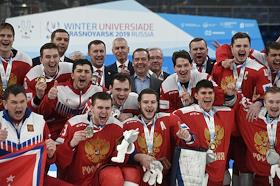 Рабочая поездка председателя правительства Дмитрия Медведева в Красноярск. Председатель правительства России Дмитрий Медведев (в центре) во время церемонии награждения игроков студенческой сборной России, занявшими 1-е место в соревнованиях во хоккею среди мужчин на XIX Всемирной зимней Универсиаде-2019, в Ледовом дворце "Кристалл арена".