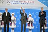 Рабочая поездка председателя правительства Дмитрия Медведева в Красноярск. XIX Всемирная зимняя Универсиада 2019. Президент FISU Олег Матыцин (третий слева) и председатель правительства России Дмитрий Медведев (четвертый справа) на церемонии закрытия Универсиады в ледовом дворце "Платинум Арена Красноярск".