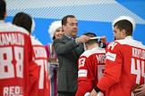 Рабочая поездка председателя правительства Дмитрия Медведева в Красноярск. Председатель правительства России Дмитрий Медведев на церемонии награждения победителей финального матча соревнований по хоккею среди мужчин между студенческими сборными России и Словакии на XIX Всемирной зимней Универсиаде-2019.