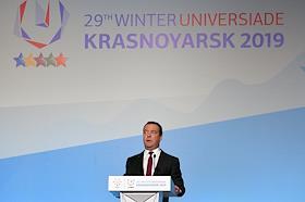 Рабочая поездка председателя правительства Дмитрия Медведева в Красноярск. XIX Всемирная зимняя Универсиада 2019. Председатель правительства России Дмитрий Медведев на церемонии закрытия Универсиады в ледовом дворце "Платинум Арена Красноярск".