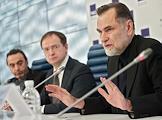 Пресс-конференция, посвященная обсуждению законодательных аспектов развития киноиндустрии и инициативам Министерства культуры России в сфере кино. Слева направо: продюсер, сценарист, генеральный директор киностудии "КИТ" Джахонгир Файзиев, министр культуры России Владимир Мединский и продюсер Сергей Сельянов на пресс-конференции в агентстве ТАСС.