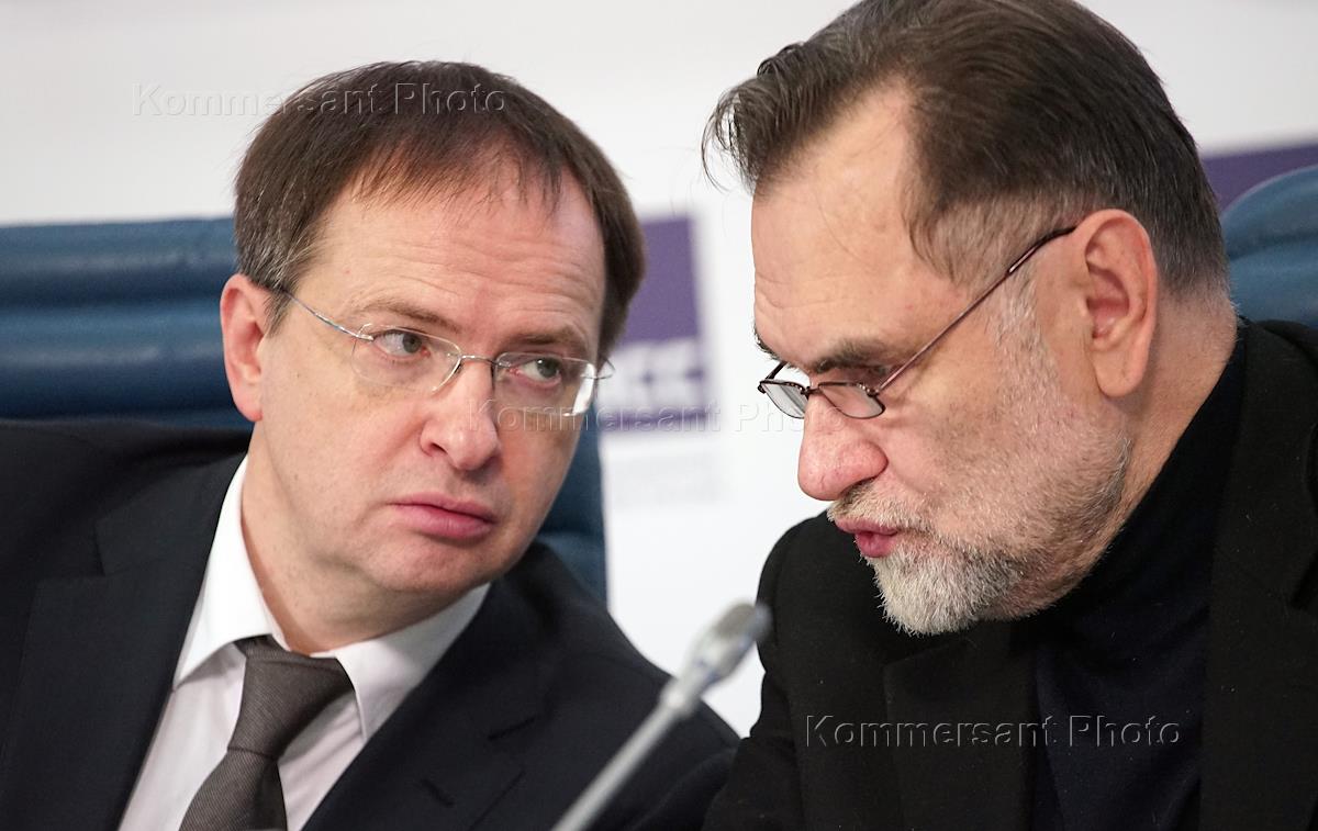 Пресс-конференция, посвященная обсуждению законодательных аспектов развития киноиндустрии и инициативам Министерства культуры России в сфере кино. Министр культуры России Владимир Мединский (слева) и продюсер Сергей Сельянов (справа) на пресс-конференции в агентстве ТАСС.