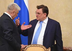 Заседание правительства России. Министр сельского хозяйства России Дмитрий Патрушев (слева) и заместитель председателя правительства России - руководитель аппарата аравительства России Константин Чуйченко (справа) перед началом заседания.