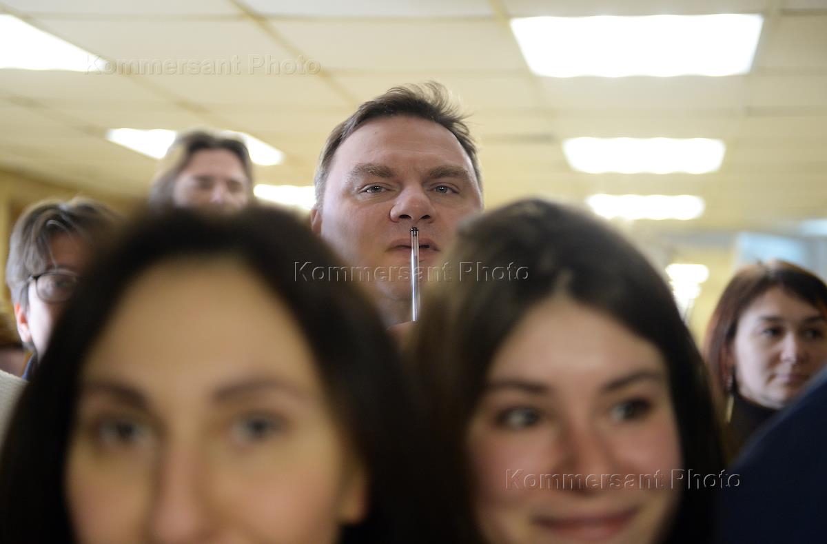 Общее собрание журналистов радиостанции "Эхо Москвы" по поводу избрания главного редактора прошло в здании редакции на Новом Арбате. Журналист Алексей Голубев (в центре) во время проведения собрания.