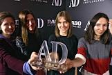 Церемония вручения премии AD Design Award прошла в Государственном музее архитектуры имени А.В. Щусева. Слева направо: победители в номинации "Офисы" (офис компании "Детский мир") сотрудники архитектурного бюро FORM архитектор Полина Дудкина, сооснователь бюро Вера Ордынь, архитектор Юлия Семкова и сооснователь бюро Ольга Тревайс во время церемонии.