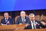 Первое совместное заседание Совета Государственной думы России и Государственного Совета Республики Крым. Слева направо: глава республики Крым Сергей Аксенов, председатель Государственной Думы (ГД) России Вячеслав Володин и лидер КПРФ, член комитета ГД России по делам Содружества Независимых Государств, евразийской интеграции и связям с соотечественниками Геннадий Зюганов во время заседания.