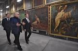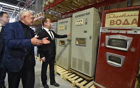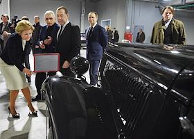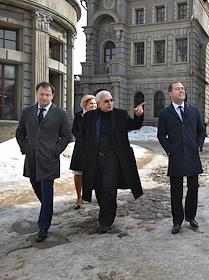 Министр культуры России Владимир Мединский (слева), кинорежиссер, генеральный директор киноконцерна "Мосфильм" Карен Шахназаров (в центре) и председатель правительства России Дмитрий Медведев (справа) во время посещения киноконцерна "Мосфильм".