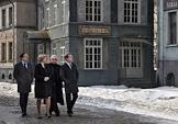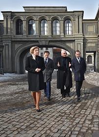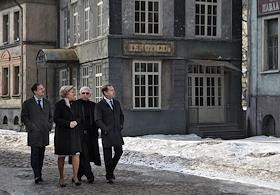 Министр культуры России Владимир Мединский (слева), заместитель председателя правительства России Ольга Голодец (вторая слева), кинорежиссер, генеральный директор киноконцерна "Мосфильм" Карен Шахназаров (в центре) и председатель правительства России Дмитрий Медведев (справа) во время посещения киноконцерна "Мосфильм".