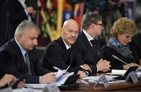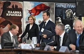 Заседание Правительственного совета по развитию отечественной кинематографии. заместитель председателя правительства России Ольга Голодец (в центре) и министр культуры России Владимир Мединский (третий справа) перед началом заседания на территории киноконцерна "Мосфильм".