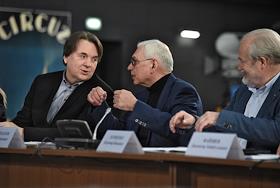 Заседание Правительственного совета по развитию отечественной кинематографии. Генеральный директор компании "Централ Партнершип" Вадим Верещагин (слева) и руководитель кинокомпании "Арт Пикчерс Студио" Федор Бондарчук (в центре) во время заседания на территории киноконцерна "Мосфильм".