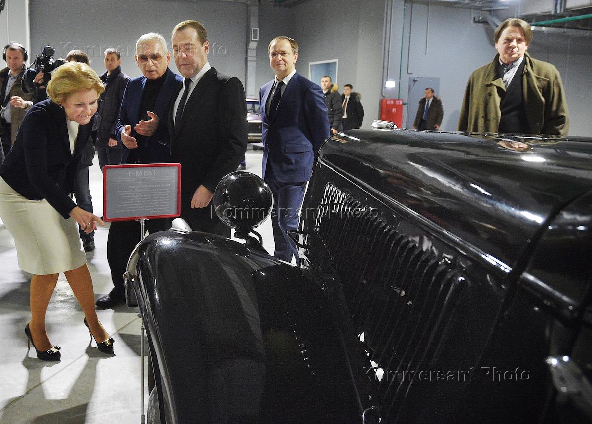 Председатель правительства России Дмитрий Медведев (слева), кинорежиссер, генеральный директор киноконцерна "Мосфильм" Карен Шахназаров (второй слева), министр культуры России Владимир Мединский (в центре) и заместитель председателя правительства России Ольга Голодец (справа) во время посещения киноконцерна "Мосфильм".