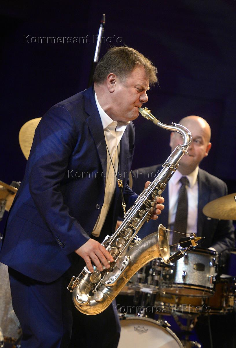 Концерт пианиста Роберта Гласпера в Московском международном Доме музыки (ММДМ). Джазмен Игорь Бутман (справа) во время выступления на концерте.