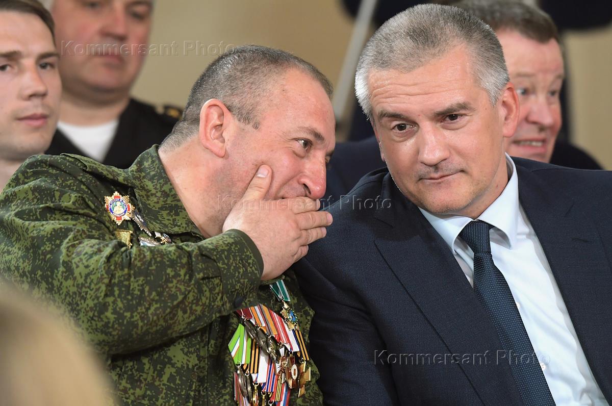 Рабочая поездка президента России Владимира Путина в Крым. Встреча президента России Владимира Путина с представителями общественности Республики Крым и Севастополя. Участник Народного ополчения Крыма Армен Мартоян (слева) и глава Республики Крым Сергей Аксенов (справа) перед началом встречи.