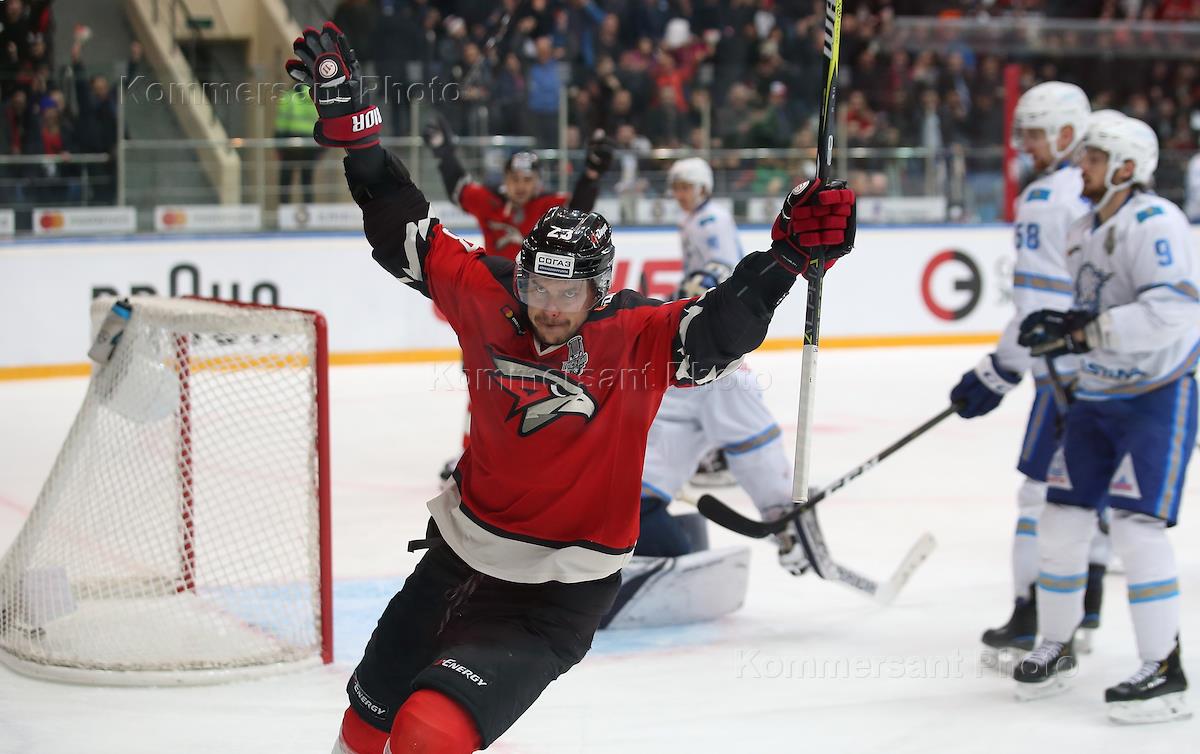 Континентальная хоккейная лига (КХЛ). Матч между командами "Авангард" (Россия, Омск) и "Барыс" (Казахстан, Астана) на стадионе "Арена-Балашиха" имени Юрия Ляпкина. Игрок команды "Авангард" Андрей Стась во время матча.