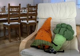 Жанровая фотография. Мастер-класс в кулинарной студии "Живи вкусно". Подушки в виде овощей на кресле в студии.