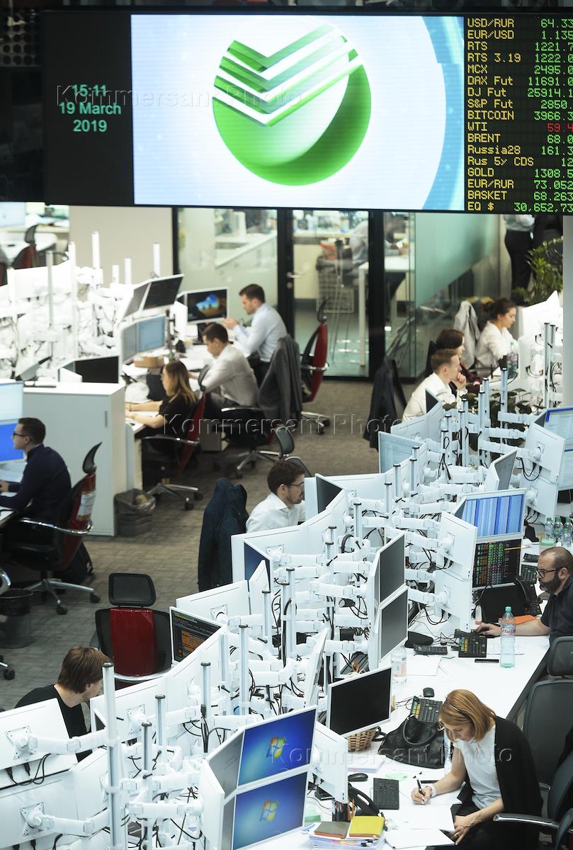 Сотрудники ПАО "Сбербанк России" во время работы в главном офисе.