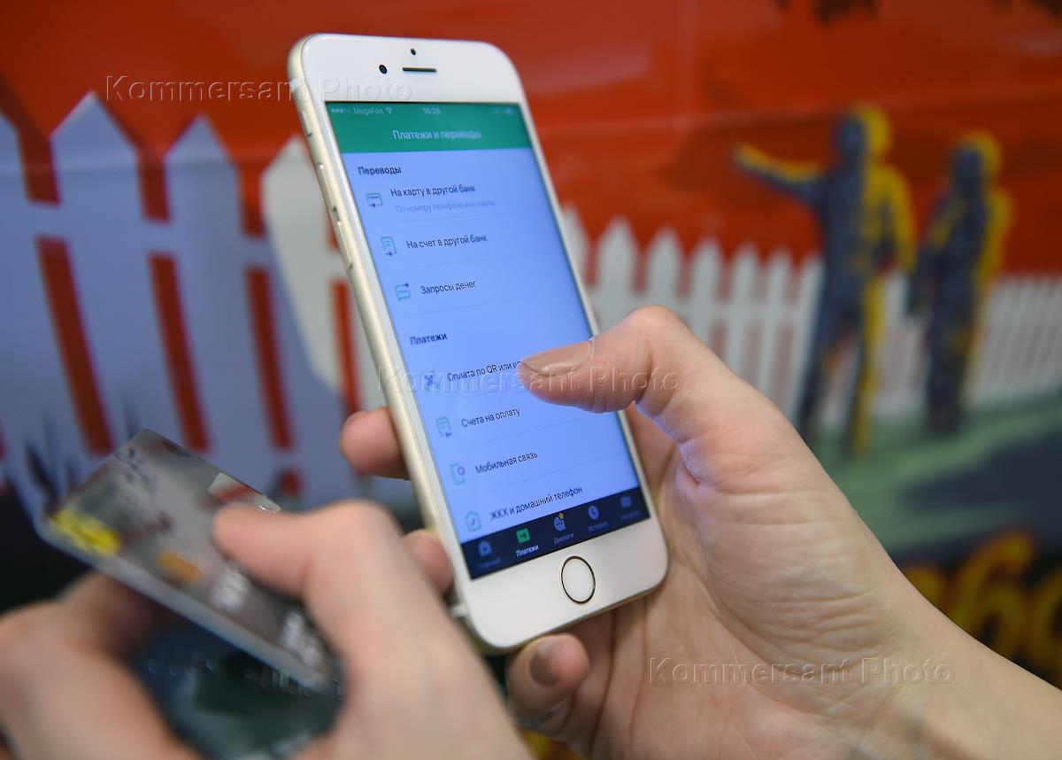 Жанровая фотография. Мобильное приложение Сбербанка с окном "Платежи" на экране мобильного телефона.