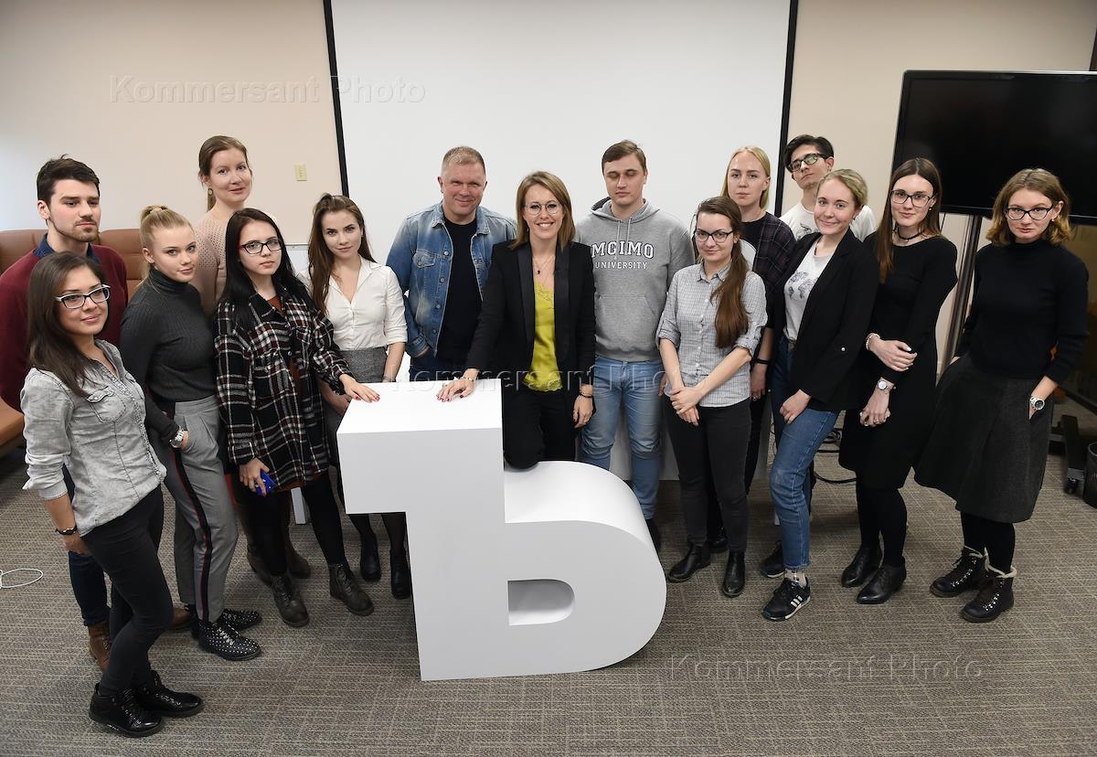 Политик Ксения Собчак (в центре, справа) и специальный корреспондент ИД "Коммерсантъ" Андрей Колесников (в центре, слева) во время совместного фотографировании после встречи со студентами Академии журналистики "Коммерсантъ".