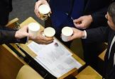 Пленарное заседание Государственной думы (ГД) России. Жанровая фотография. Депутаты чокаются бумажными стаканчиками с водой.