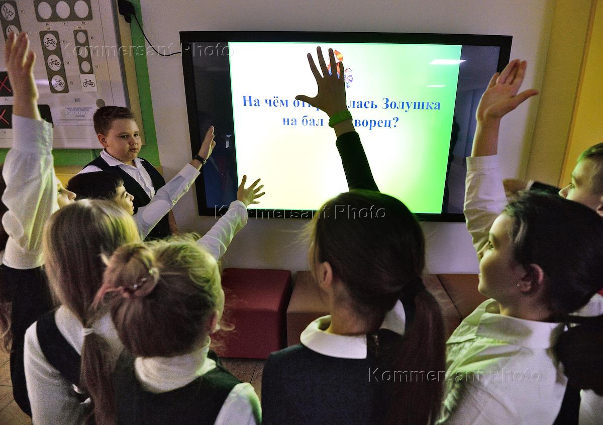 Государственное бюджетное общеобразовательное учреждение города Москвы "Школа № 2030". Ученики начальной школы у экрана интерактивного телевизора во время игры на перемене.