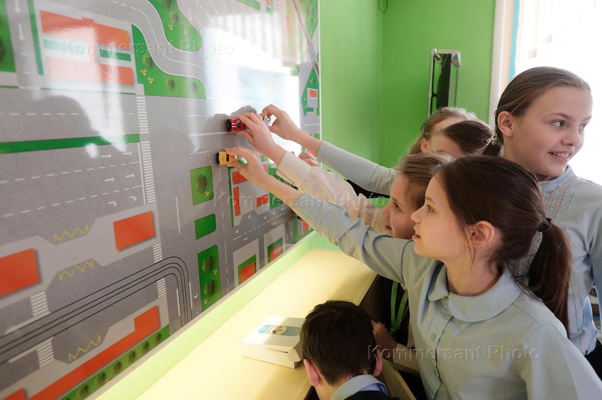 Государственное бюджетное общеобразовательное учреждение города Москвы "Школа № 2030". Ученики начальной школы на уроке во время изучения правил дорожного движения. Дорожные знаки.
