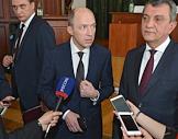 Представление временно исполняющего обязанности главы республики Алтай Олега Хорохордина членам правительства региона, депутатам и главам муниципалитетов. Временно исполняющий обязанности главы республики Алтай Олег Хорохордин (в центре) и полномочный представитель президента России в Сибирском федеральном округе Сергей Меняйло (справа) во время встречи с журналистами.