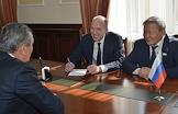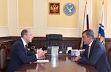 Представление временно исполняющего обязанности главы республики Алтай Олега Хорохордина членам правительства региона, депутатам и главам муниципалитетов. Временно исполняющий обязанности главы республики Алтай Олег Хорохордин (слева) и полномочный представитель президента России в Сибирском федеральном округе Сергей Меняйло (справа) во время встречи.