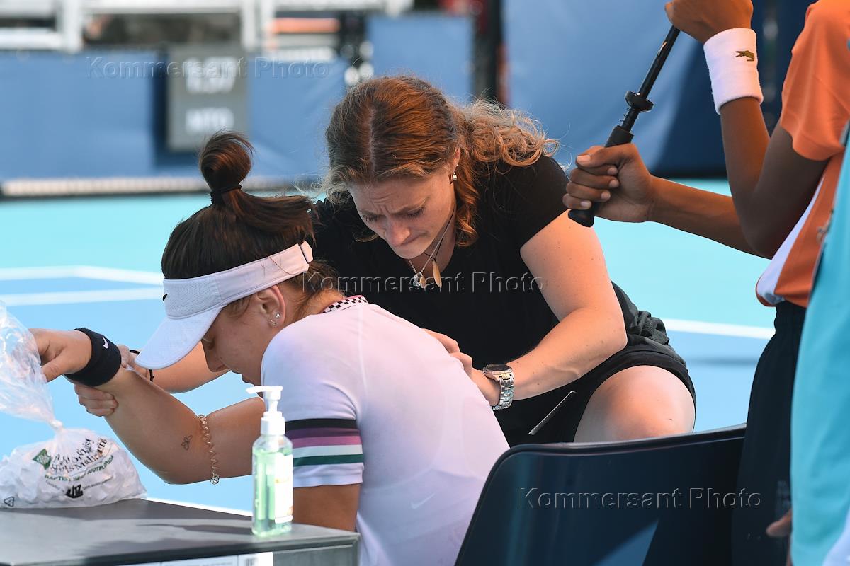 Теннисный турнир Miami Open 2019. Канадская теннисистка Бьянка Андрееску (слева) во время матча против эстонской теннисистки Анетт Контавейт.