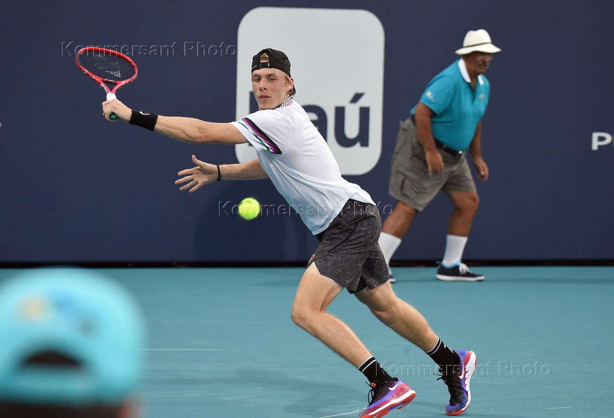 Теннисный турнир Miami Open 2019. Канадский теннисист Денис Шаповалов во время матча против российского теннисиста Андрея Рублева.