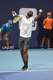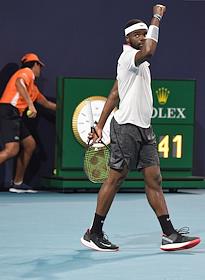 Теннисный турнир Miami Open 2019. Американский теннисист Фрэнсис Тиафо во время матча против испанского теннисиста Давида Феррера.