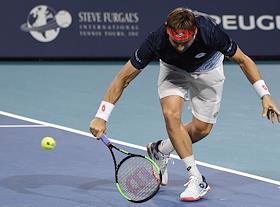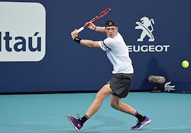 Теннисный турнир Miami Open 2019. Бельгийский теннисист Давид Гоффен во время матча против итальянского теннисиста Марко Чеккинато.
