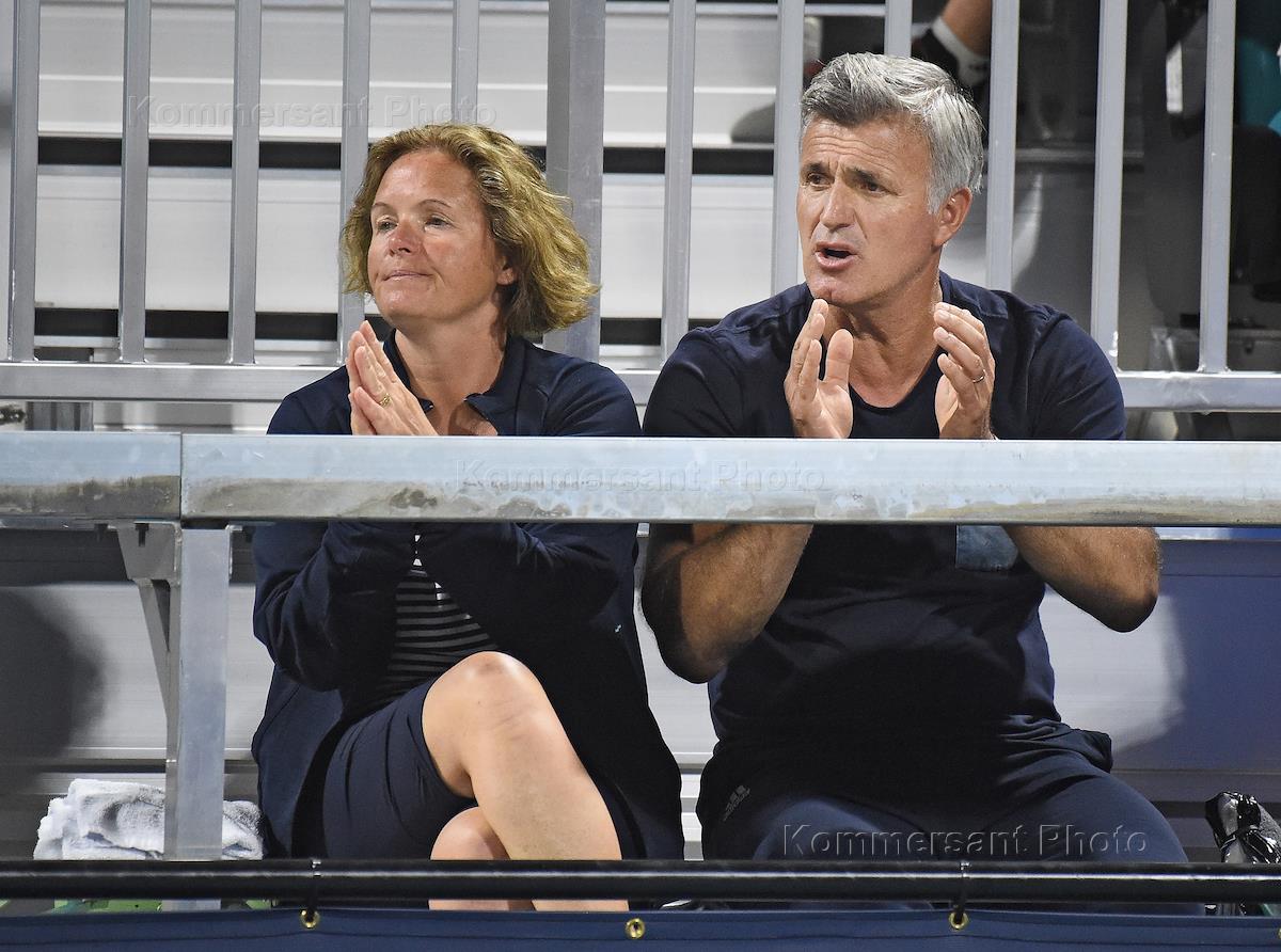 Теннисный турнир Miami Open 2019. Родители греческого теннисиста Стефаноса Циципаса Юлия Сальникова (слева) и Апостолос Циципас (справа) на трибуне болельщиков во время матча их сына против аргентинского теннисиста Леонардо Майера.