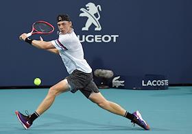 Теннисный турнир Miami Open 2019. Канадский теннисист Денис Шаповалов во время матча против российского теннисиста Андрея Рублева.
