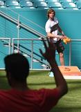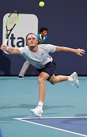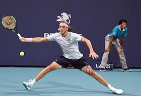 Теннисный турнир Miami Open 2019. Греческий теннисист Стефанос Циципас во время матча против аргентинского теннисиста Леонардо Майера.