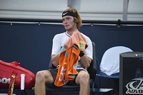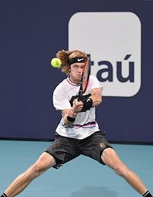 Теннисный турнир Miami Open 2019. Российский теннисист Андрей Рублев во время матча против канадского теннисиста Дениса Шаповалова.