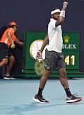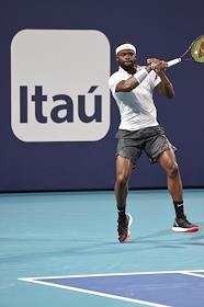 Теннисный турнир Miami Open 2019. Американский теннисист Фрэнсис Тиафо во время матча против испанского теннисиста Давида Феррера.