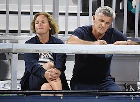 Теннисный турнир Miami Open 2019. Родители греческого теннисиста Стефаноса Циципаса Юлия Сальникова (слева) и Апостолос Циципас (справа) на трибуне болельщиков во время матча их сына против аргентинского теннисиста Леонардо Майера.