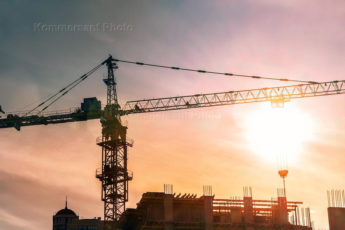 Жанровая фотография. Строительство жилого дома. Отражение в луже башенного крана.