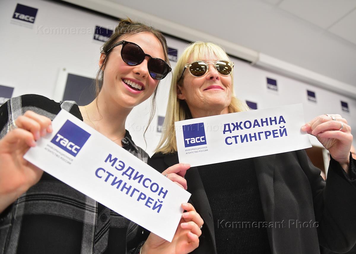 Пресс-конференция в формате телемоста "Санкт-Петербург – Москва", посвященная выходу книги певицы Джоанны Стингрей "Стингрей в стране чудес" в агентстве ТАСС. Певица Джоанна Стингрей (справа) с дочерью Мэдисон Стингрей (слева) на пресс-конференции.