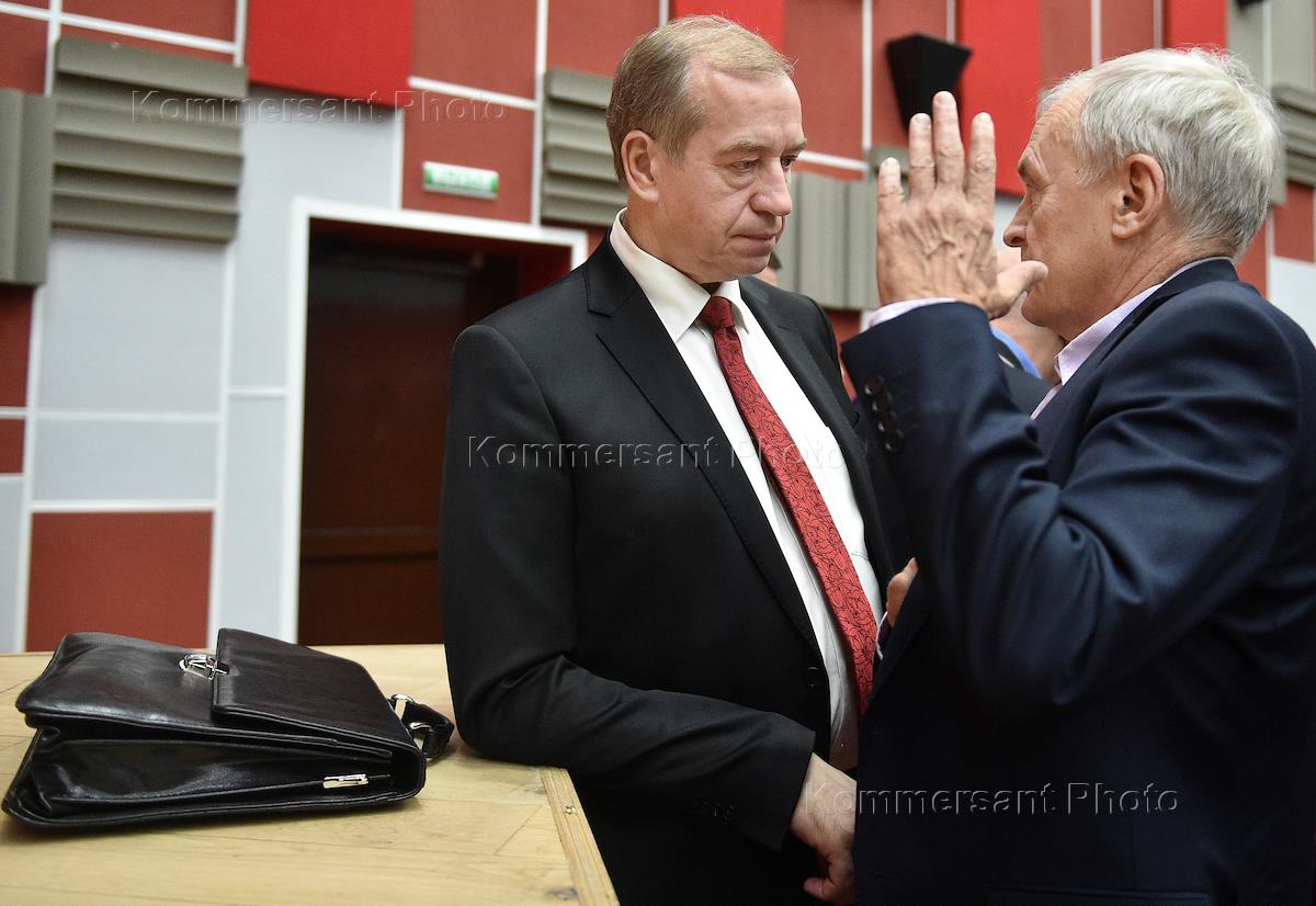 Губернатор Иркутской области, первый секретарь Иркутского горкома КПРФ Сергей Левченко (слева) и первый секретарь Новосибирского обкома КПРФ, мэр Новосибирска Анатолий Локоть (справа) на совместном мартовском пленуме центрального комитета и центральной контрольно-ревизионной комиссии Коммунистической партии России в оздоровительном комплексе "Снегири" в селе Рождествено.