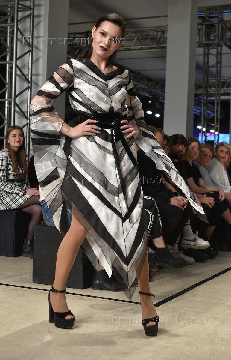 Неделя моды Mercedes-Benz Fashion Week Russia в ЦВЗ "Манеж". Показ новой коллекции "Дай пять", победителей конкурса "Дай пять! Дизайнер будущего". Актриса Елизавета Арзамасова во время показа.
