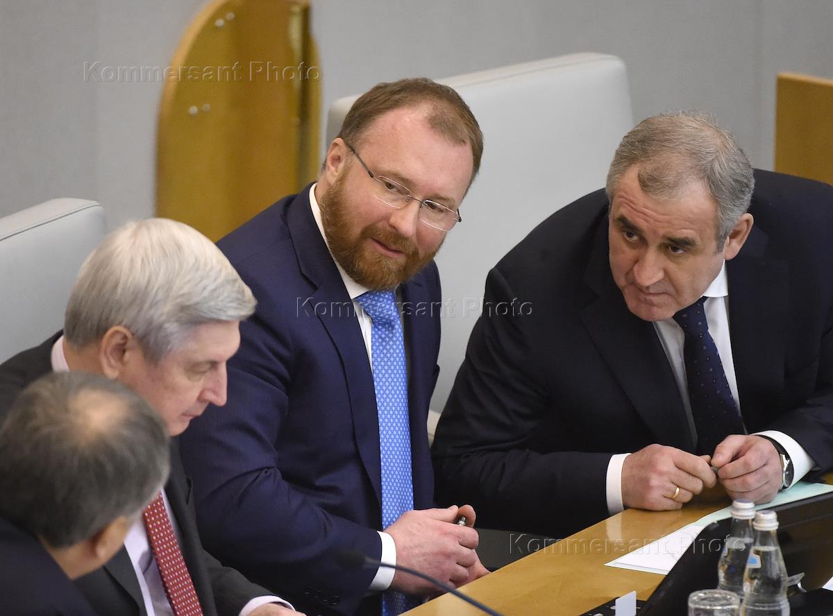 Пленарное заседание Государственной думы (ГД) России. Член комитета ГД России по труду, социальной политике и делам ветеранов Ольга Павлова (слева), заместитель председателя комитета ГД России по жилищной политике и жилищно-коммунальному хозяйству Вадим Булавинов (второй справа) и член комитета ГД России по федеративному устройству и вопросам местного самоуправления Леонид Черкесов (справа) перед началом заседания.