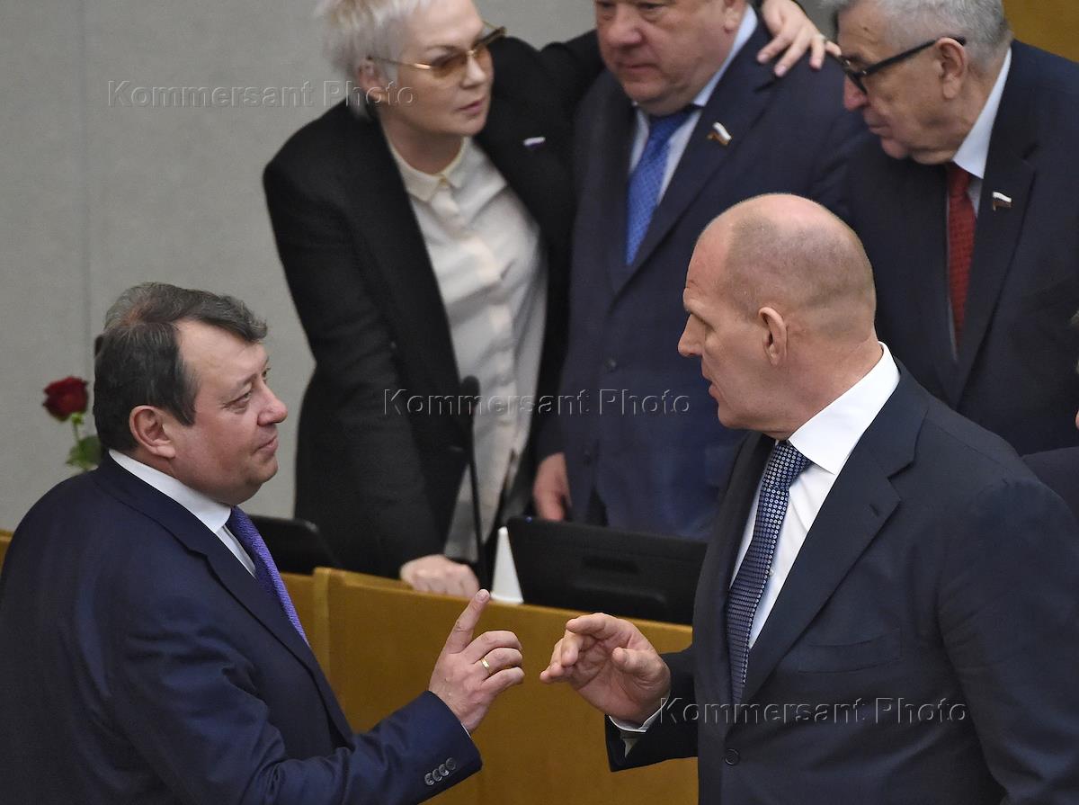 Пленарное заседание Государственной думы (ГД) России. Член Комитета ГД России по информационной политике, информационным технологиям и связи Евгений Ревенко (слева) и председатель комитета ГД России по природным ресурсам, собственности и земельным отношениям Николай Николаев (справа) во врея заседания.