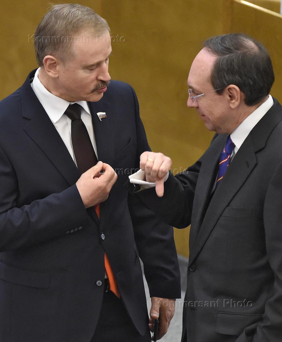 Пленарное заседание Государственной думы (ГД) России. Член комитета ГД России по бюджету и налогам Валерий Скруг (слева) и член комитета ГД России по энергетике Александр Карелин (справа) перед началом заседания.
