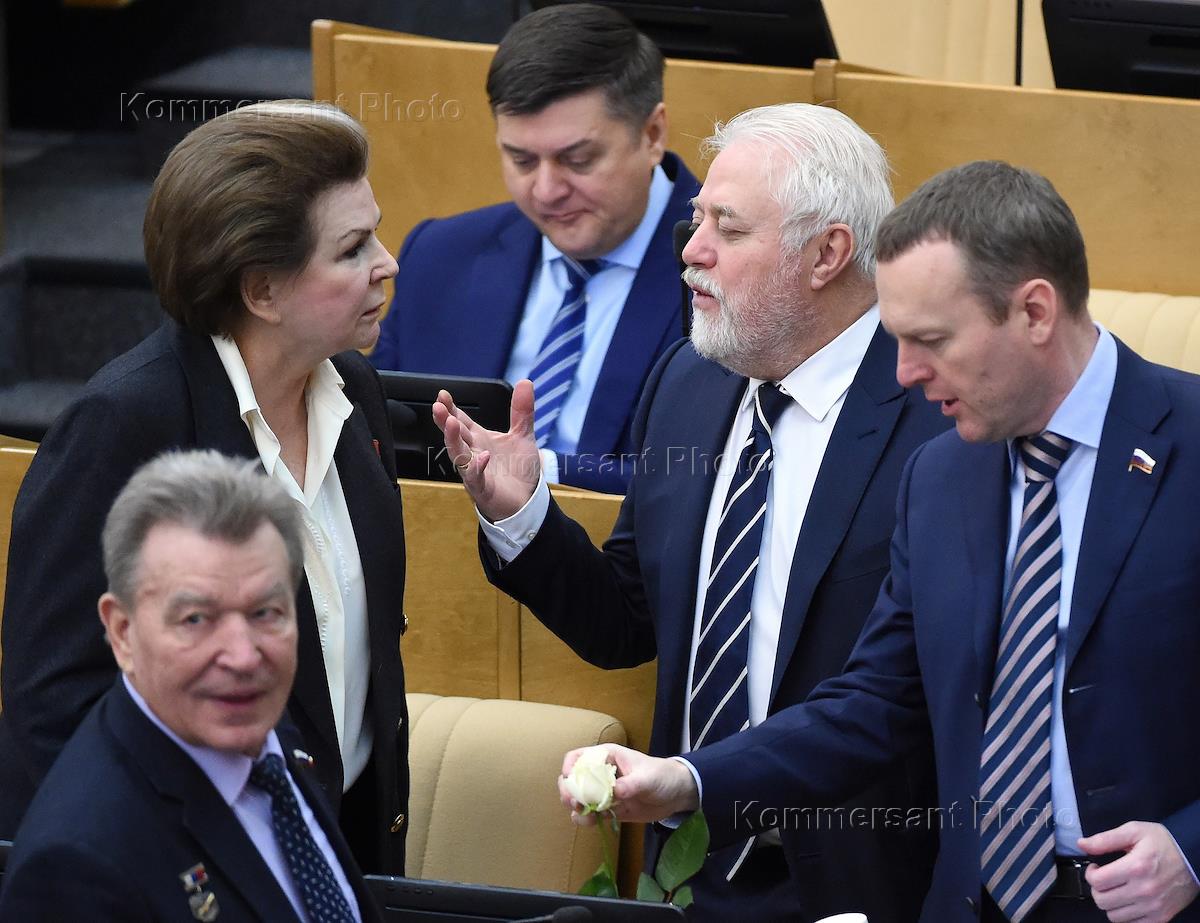 Пленарное заседание Государственной думы (ГД) России. Слева направо: член комитета ГД России по природным ресурсам, собственности и земельным отношениям Николай Антошкин, заместитель председателя комитета ГД России по федеративному устройству и вопросам местного самоуправления Валентина Терешкова, член комитета ГД России по безопасности и противодействию коррупции Иван Квитка, первый заместитель председателя комитета ГД России по финансовому рынку Игорь Дивинский и член комитета ГД России по контролю и Регламенту Константин Бахарев перед началом заседания.